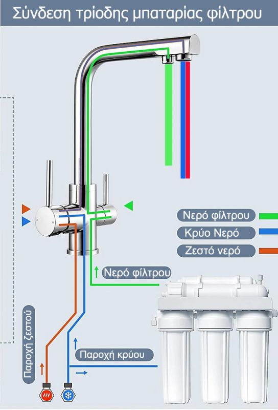 Μπαταρία τρίοδη κουζίνας θερμομικτική, ζεστού κρύου και φίλτρου