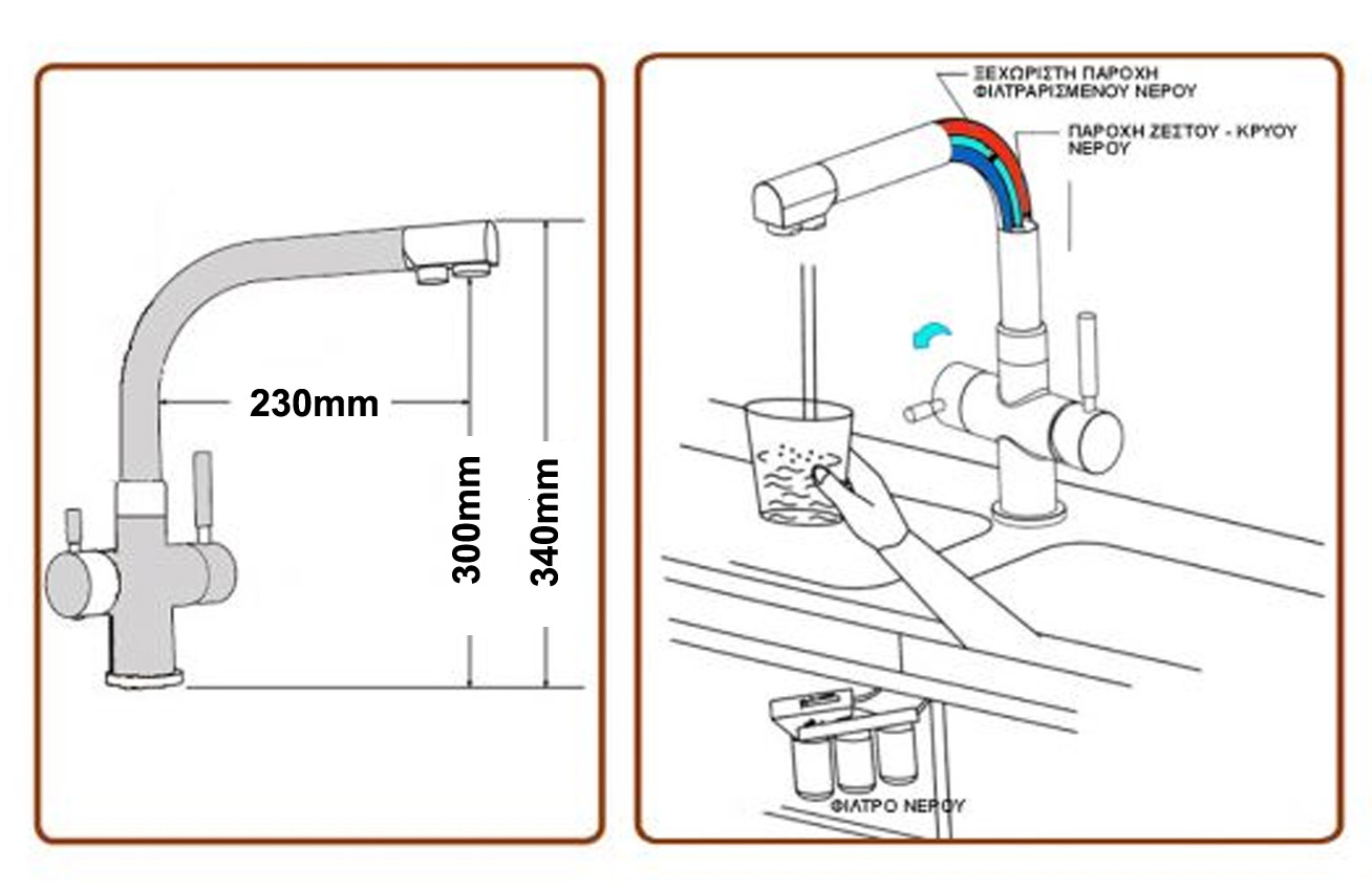 Με 2 ξεχωριστές εξόδους (κρύο νερό - ζεστό νερό) - φιλτραρισμένο νερό.